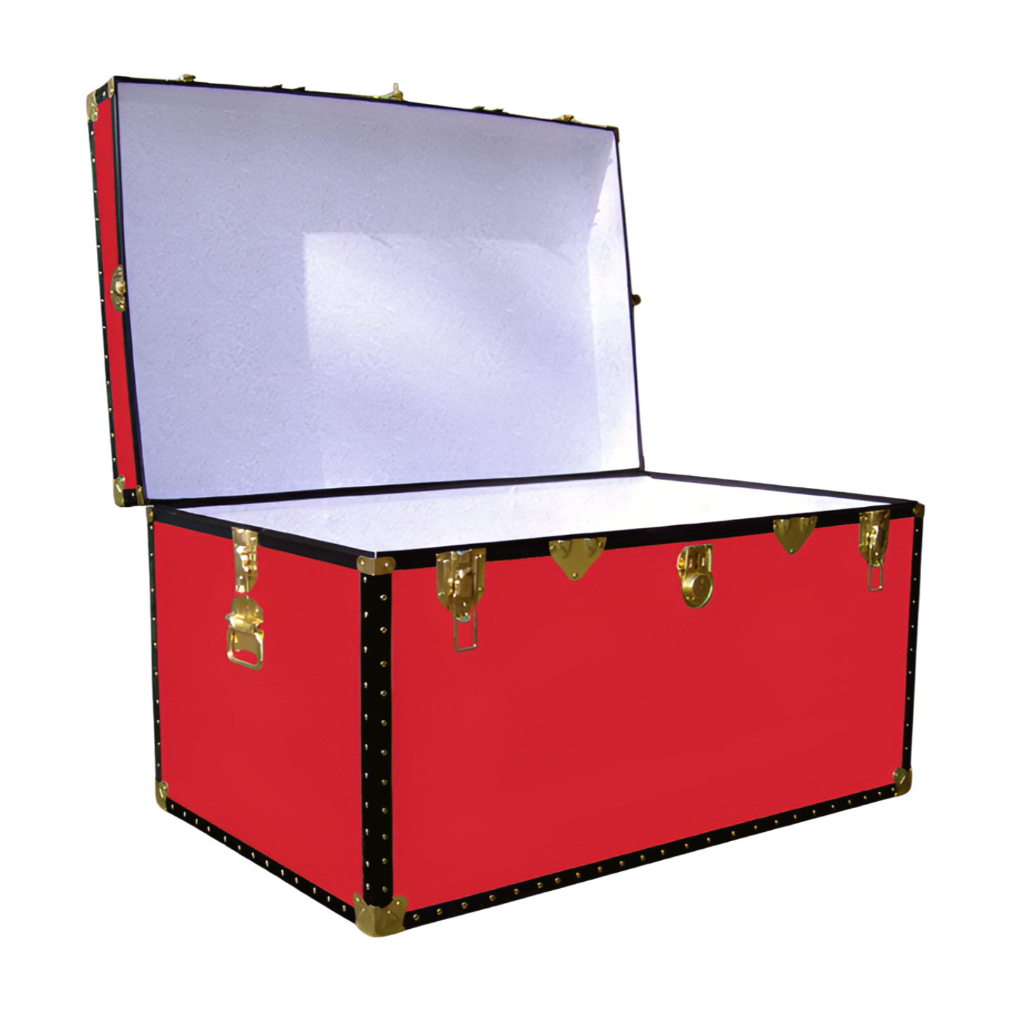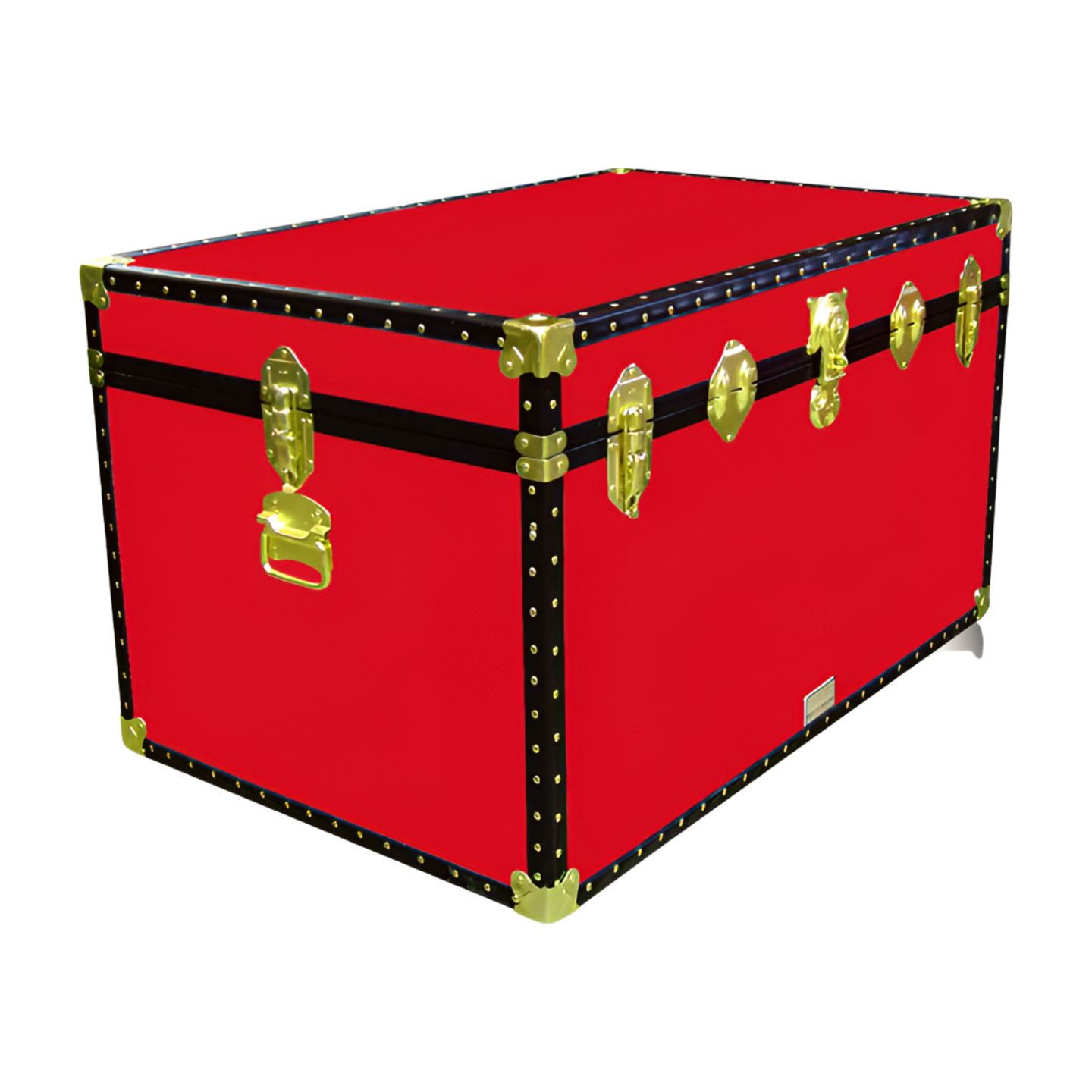 Furnished with brass plated fittings consisting of a central pad-lockable hasp lock (padlock not included), 4 clasp, catches, strong trunk